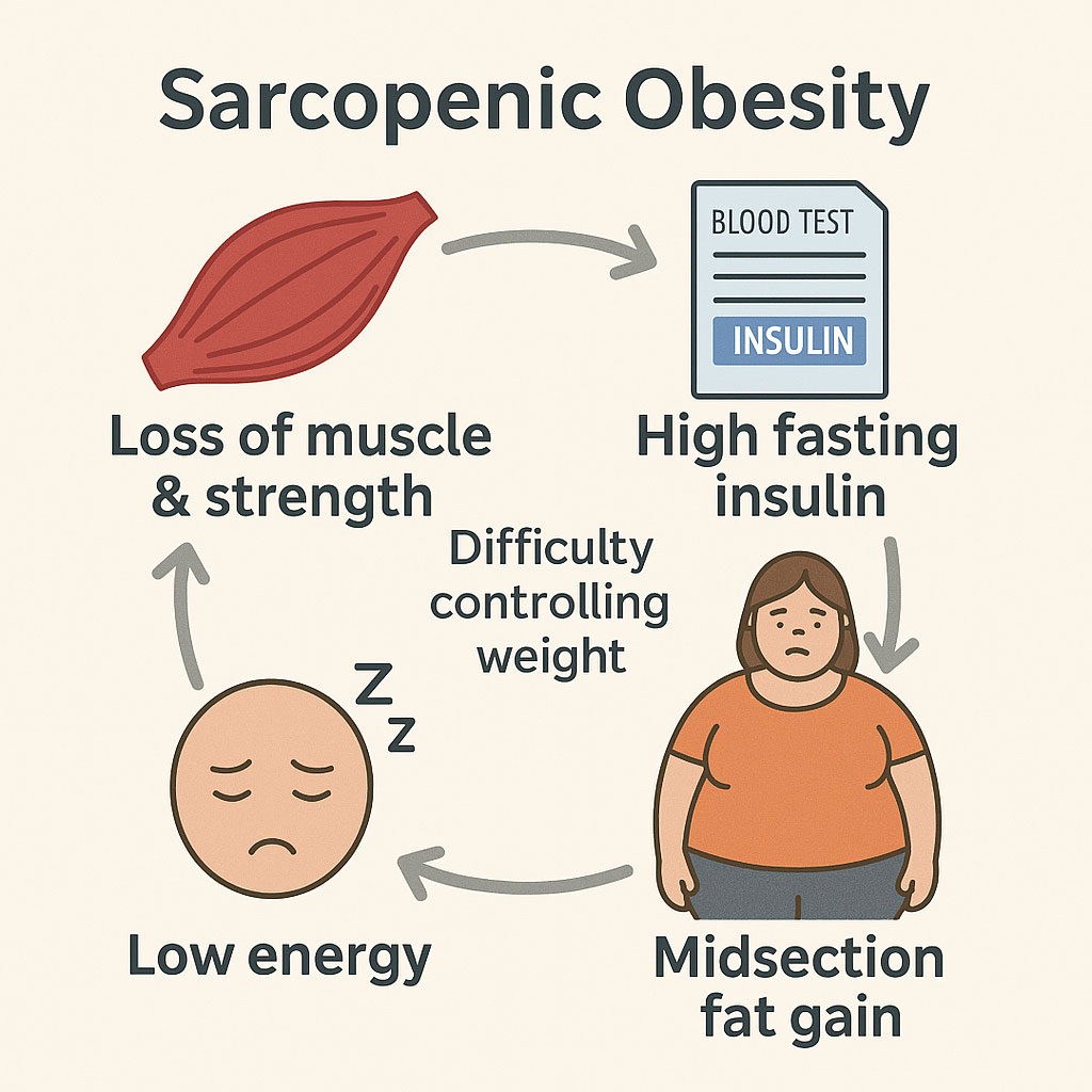 | Sarcopenic Obese | Low | High | Severe insulin resistance, fatigue, poor function |